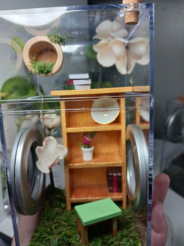 Items attached to the walls of the enclosure should be sturdy and unable to fall off when the enclosure is moved around. Gorilla Brand hot glue, E6000 and neodymium magnets are safe to use, but keep in mind curing times when using glues and make sure everything is securely attached before inviting your jumping spider in for a tour.
